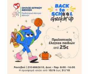 Παιδιατρικό Κέντρο Αθηνών: «Νέα σχολική χρονιά - Back to school»04.09.2023 Αθήνα, 10 Ιουνίου 2024 – Προληπτικοί έλεγχοι υγείας «Back to school» σε προνομιακές τιμές. Για μια σχολική χρονιά γεμάτη υγεία και ασφάλεια... |